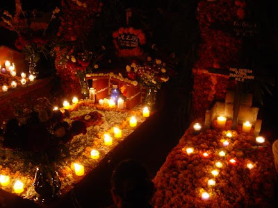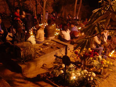 It is a happy celebration, not spooky or sad at all. In South Mexico and the Yucatan cemeteries come alive on Nov. 1st and 2nd (in the cemeteries near Cancun people get the bodies out of the graves to clean the bones, so that the souls see the clean body when they return). Villages (as we saw the previous day) celebrate with comparsas - brass bands and inhabitants dressed as dead people - dancing in the street and visiting one house after another. The whole village follows as well as the occasional tourist like me.